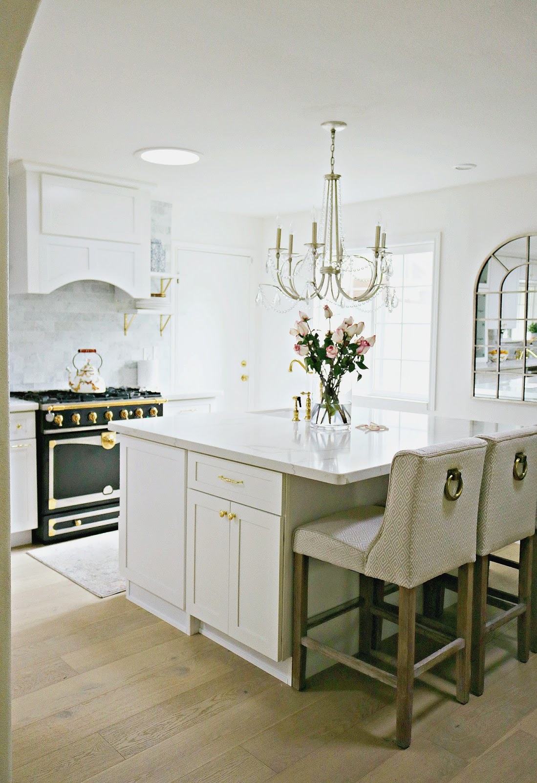 For the fixtures, I went with all brass for the knobs, drawer pulls and kitchen faucets. I love how it complements the brass knobs on the La Cornue stove.
