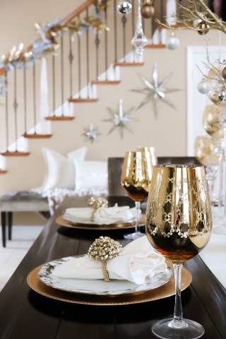 Gold tea light candle holders, stemware & napkin rings are from ZGallerie. Dinner plates are from Marshalls.