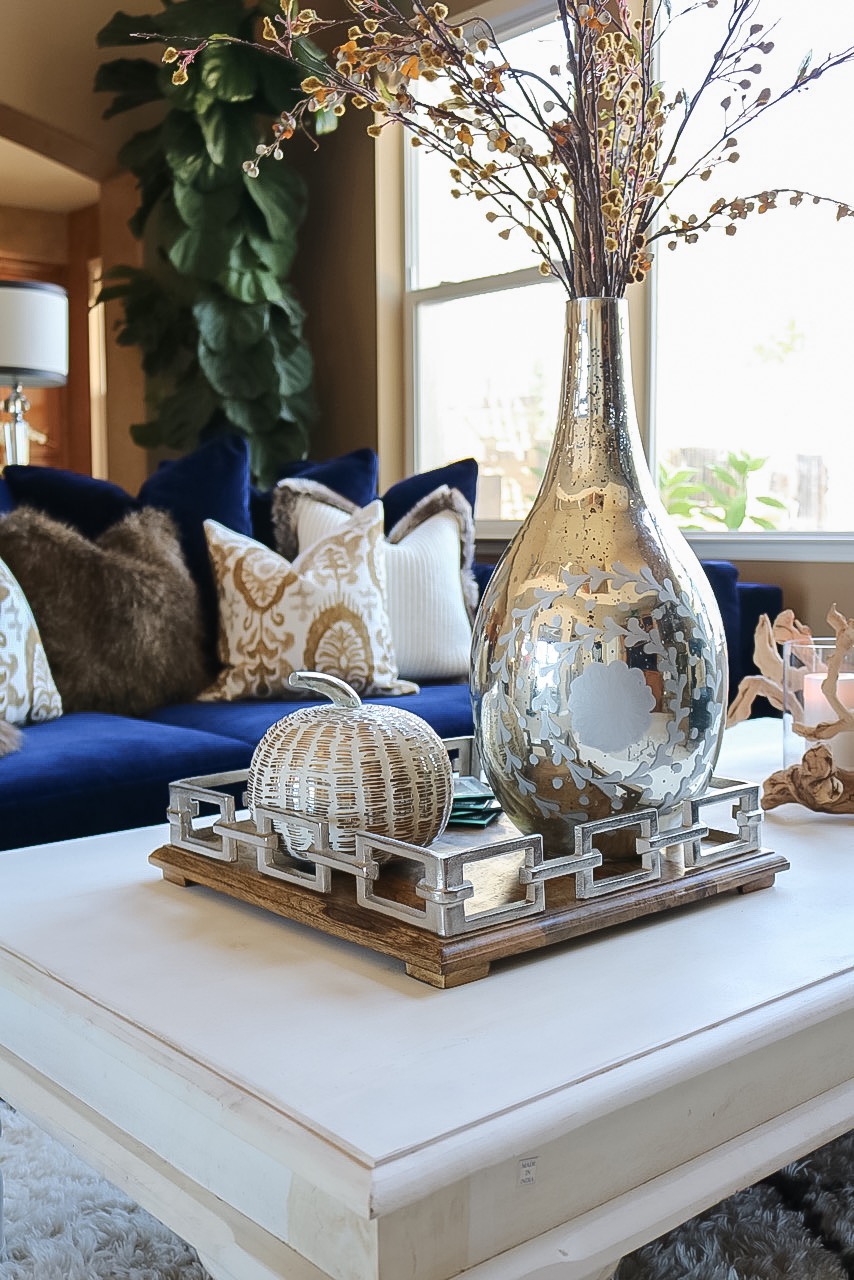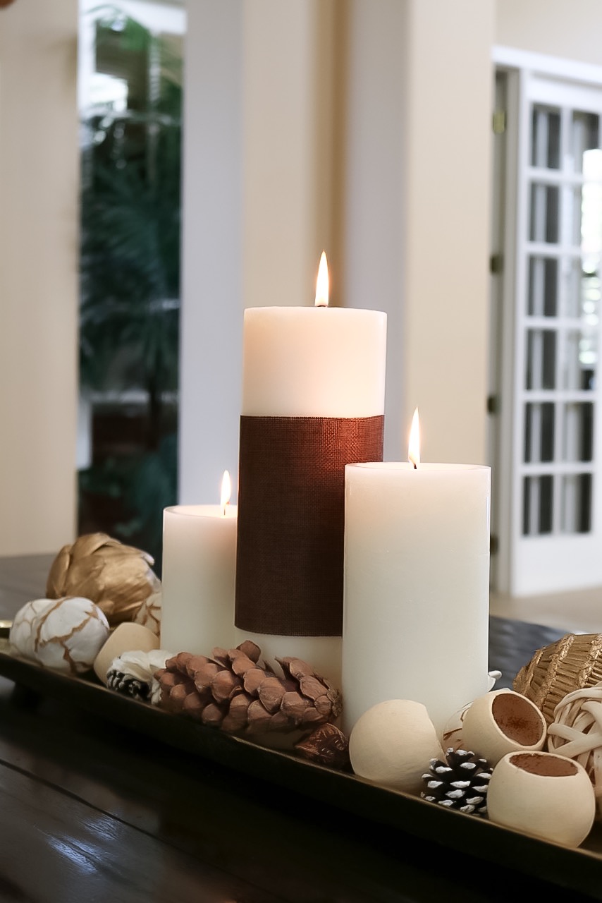 The gold leaf tray is from HomeGoods and I simply added Fall potpourri around the candles and you can feel Fall is in the air when you see this tray sitting on my dining room table when you walk in.