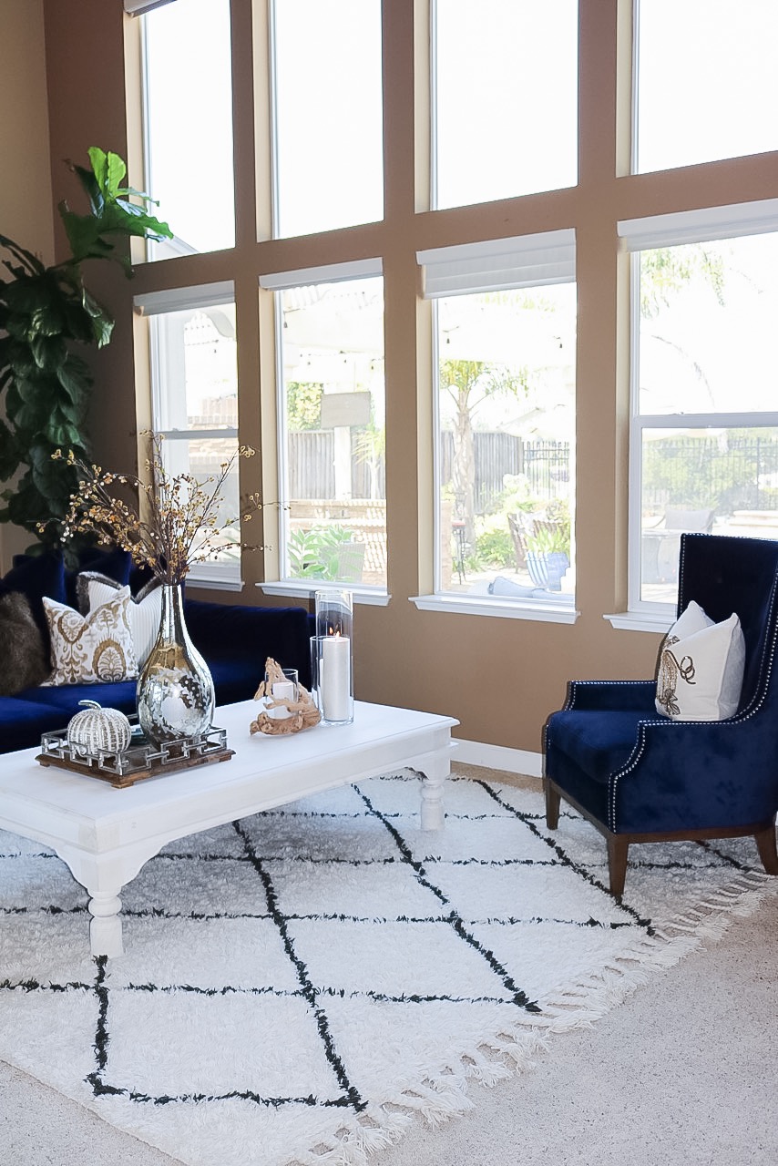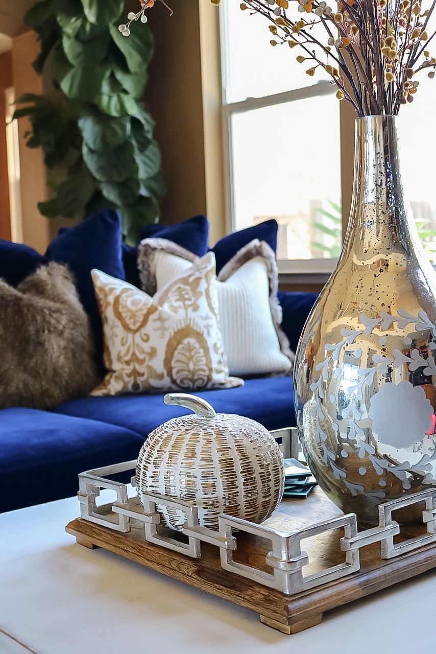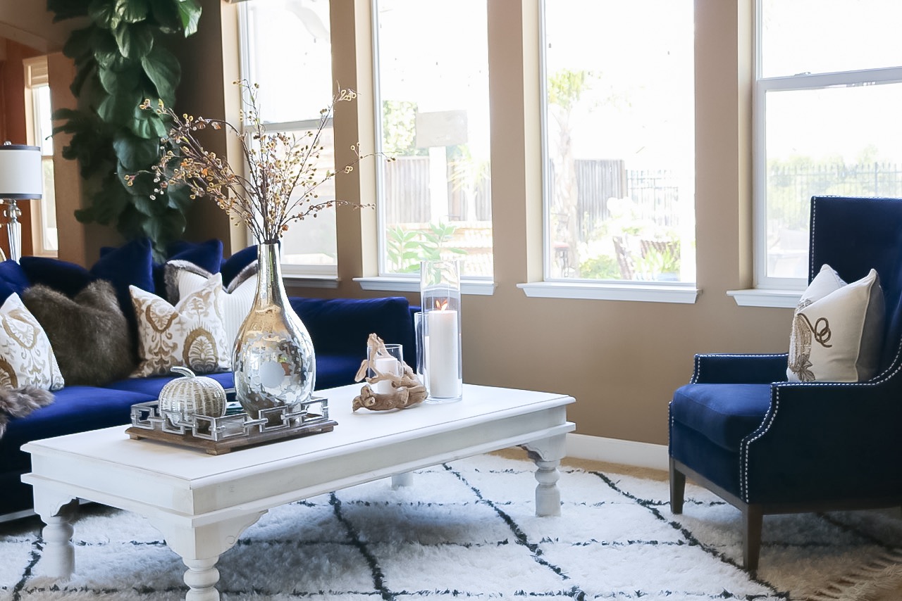 Oh Laila, that navy is absolutely mesmerizing!!!!!!! That change was brilliant, my friend. I just came from Amy's tour and totally drooled over all her navy (i'm crushing hard on navy right now...can you tell?) and then come here and find more navy gorgeousness. I'm definitely add it into my family room now....you've totally inspired me. I'm with you on the fall colors but with the navy it is exquisite! Now that I've incorporated gold into my home this year, I'm loving them more. You scored on that chair and I'm dying over that pillow! Everything is perfect and such a lovely way to welcome fall! Thanks so much for sharing your gorgeous home with us and being a part of this tour! Muah! xxxxx....