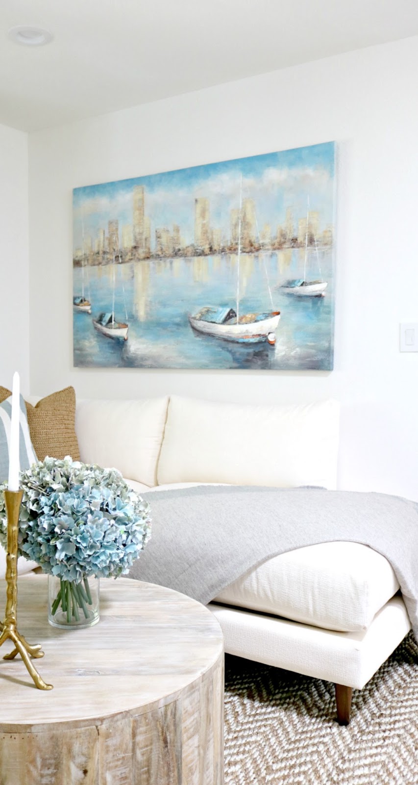 I'm also in love with this gorgeous canvas print I was lucky to find from my local store Tuesday Morning. It fits my coastal theme so well! This is a much larger canvas but I've linked a similar one you can find here! And linked this beautiful throw I found from Arhaus!