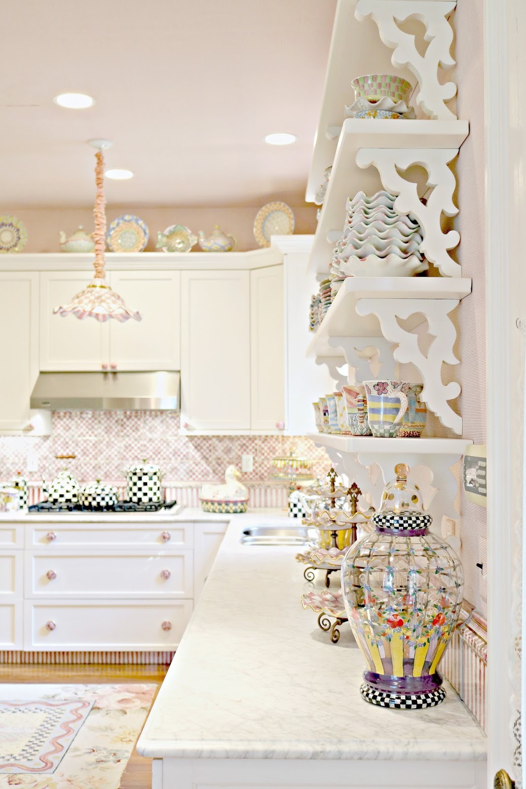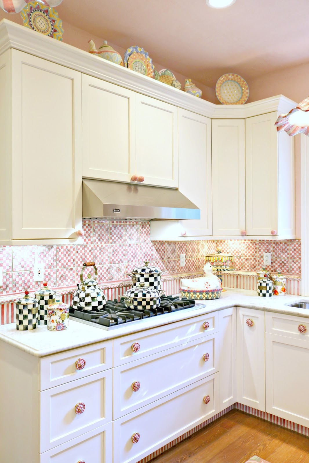 Ok, lets take a moment to absorb all of this! I felt like I was in heaven when I first saw this room, it says GORGEOUS all over! The all white kitchen, the pink back splash matching the knobs and the Courtly Check enamel ware on the stove...a piece of heaven I tell ya!