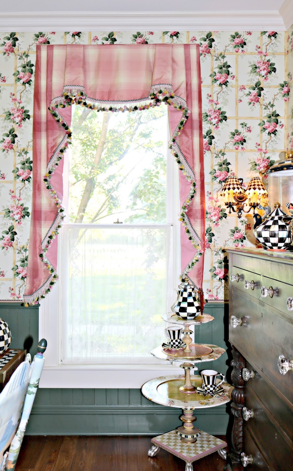 Moving on to one of the other rooms, that wall paper is so pretty! Pink is one of my favorite colors and when I see it combined with flowers...oh it just fills my heart! And that vintage 3 tier tray, my gosh it's adorable!